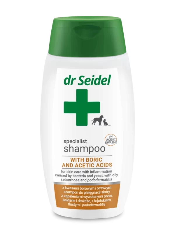 - Dr Seidel Szampon Dla Psa Kota Kwas Borowy i Octowy 2x220ml to specjalistyczny kosmetyk dla zwierząt z problemami skórnymi.