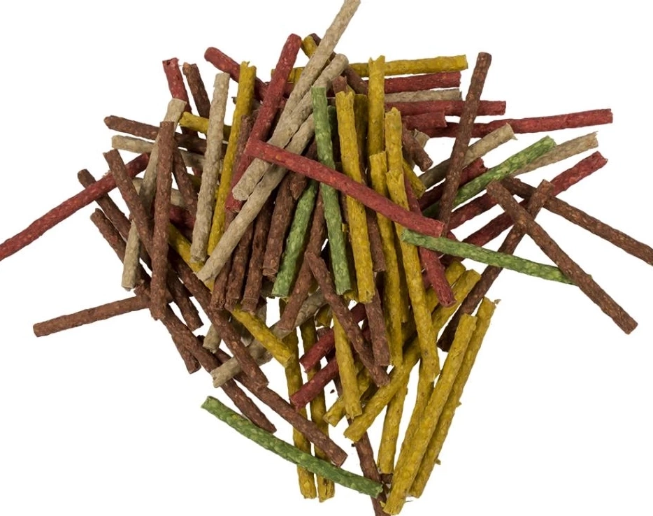 Przysmak dla psa, w postaci cienkich kabanosików ze skóry bydlęcej oraz kwiatów ryżu.