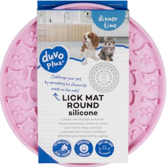 Duvo+ Lick Mat Round jest wykonana z elastycznego silikonu, dzięki czemu jest trwała i bezpieczna w użytkowaniu. Wzorki kostek na dnie sprawiają, że mata wygląda estetycznie, ale także sprawnie ukrywają serwowane jedzonko. Wystarczy, że rozłożysz na jej powierzchni płynny przysmak, taki jak pasztet czy ulubioną mokrą lub suchą karmę. Twój pies lub kot będzie z przyjemnością wylizywać smakołyki przez długi czas - zachowanie to ma działanie uspokajające i relaksujące.