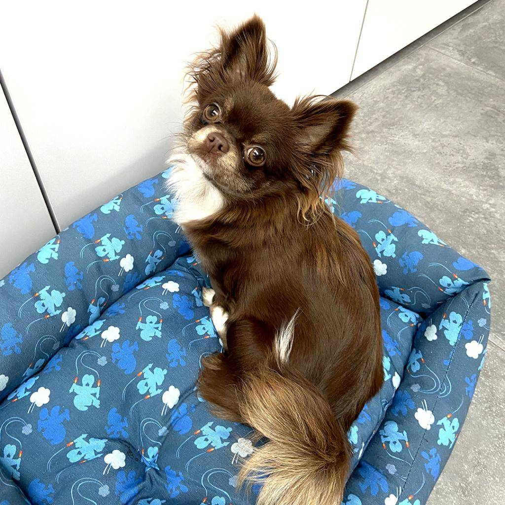 Wygodne legowisko dla psa lub kota. Ze smerfastycznym wzorem, w odcieniach koloru niebieskiego.