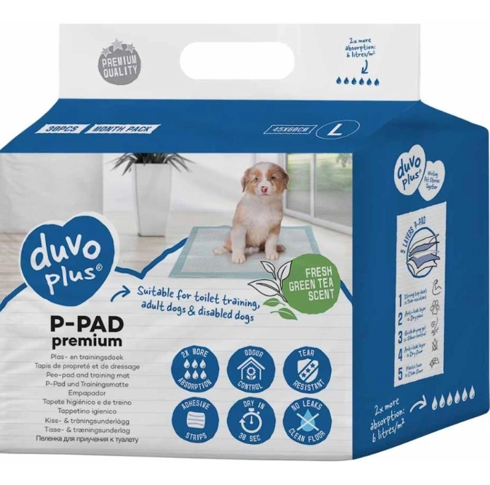 Higieniczne podkłady dla psa Duvo+ P-Pad Standard to niezbędna pomoc w procesie nauki czystości dla szczeniąt oraz wygodne rozwiązanie dla psów z nietrzymaniem moczu.