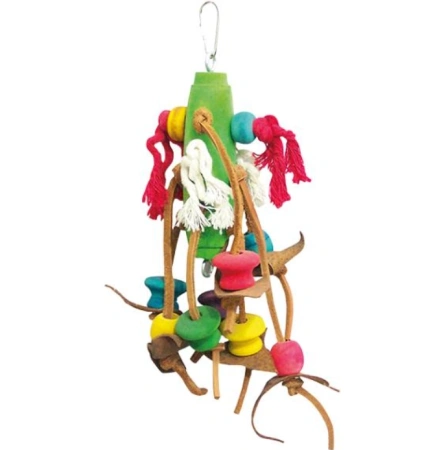 Zabawka dla ptaków Duvo+ Bird Toy to zawieszka do klatki z drewna i skórzanych paseczków.
