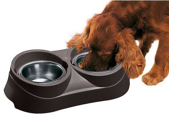 Zestaw pełni rolę podwójnej miski - plastikowa podstawa z dwoma wgłębieniami na miski ze stali nierdzewnej.