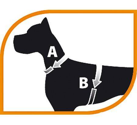 Aby znaleźć najbardziej odpowiedni rozmiar dla Twojego przyjaciela, należy dokładnie zmierzyć obwód klatki piersiowej (pomiar B) oraz szyi (pomiar A). Na podstawie minimalnych i maksymalnych pomiarów, możesz wybrać produkt, który jest właśnie dla Twojego pupila.