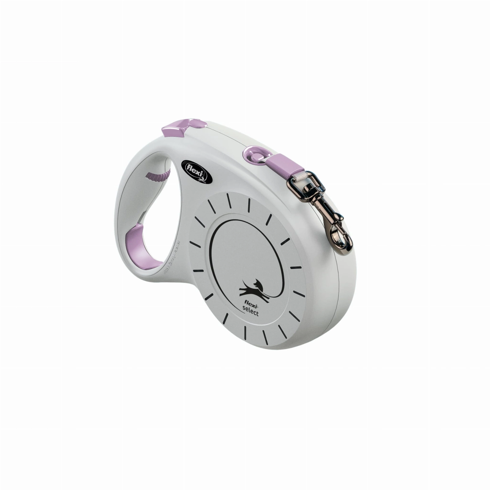 Smycz Flexi Select to najwyższej jakości automatyczna smycz na taśmie, wyróżniająca się opatentowaną funkcją regulacji maksymalnej długości. Jest przeznaczona dla psów do wagi 25 kg.