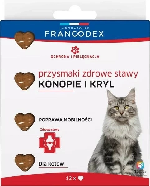 - Francodex Przysmak dla Kota Na Stawy Konopie Kryl 12szt to smakowita przekąska w formie pastylek, które pomogą Ci wzmocnić stawy Twojego mruczka.