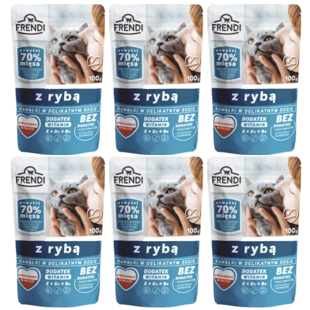 - Frendi Mokra Karma dla Kota Ryba Sos 6x100g to 6 saszetek karmy mokrej dla kotów dorosłych, która zawiera powyżej 70% mięsa.