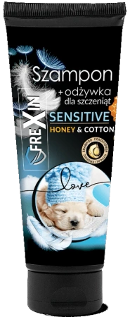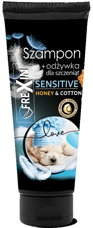 Szampon linii FreXin stworzony z myślą o delikatnej skórze szczeniąt, wzbogacony o starannie opracowaną, łagodną formułę. Miód intensywnie nawilża skórę i sierść, zapobiegając jej łamliwości. Olej z nasion bawełny pielęgnuje i nawilża, a także wzmacnia cebulki włosowe. Zawarte w składzie witaminy odżywiają włos nadając blask i ułatwiając rozczesywanie.