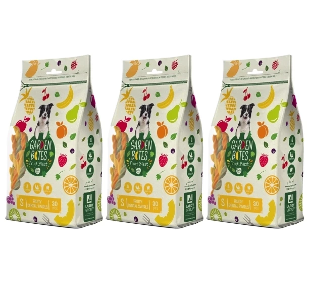 - Garden Bites Fruity Dental Swirls S 90szt 3x230g to zestaw zdrowych bezglutenowych przekąsek dla Twojego psa pomagających utrzymać prawidłową higienę zębów pupila. Zestaw 3 opakowań