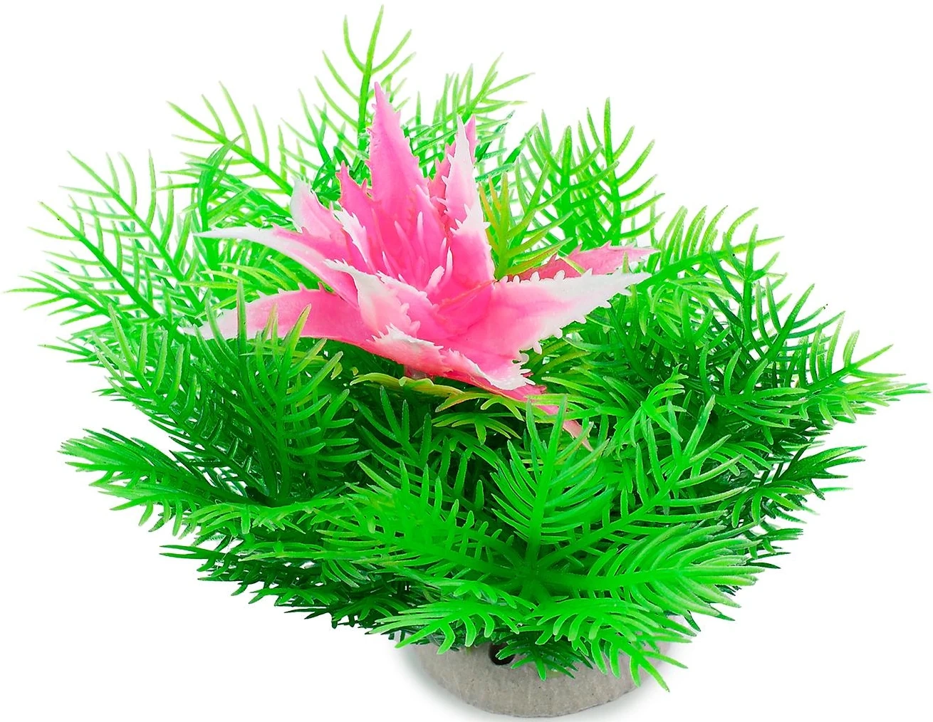 Sztuczna roślina do akwarium Happet w kolorze zielonym, z różowym kwiatem.