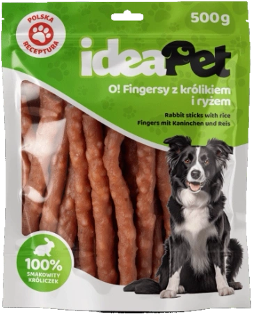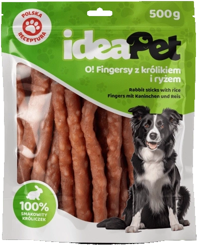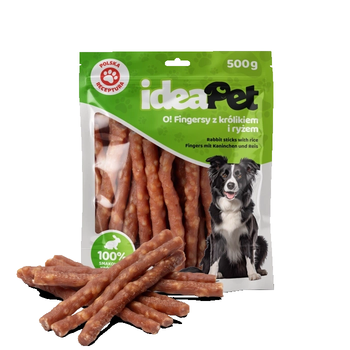 - Ideapet Przysmak dla Psa Fingersy Królik Ryż 500g to smakowite kąski dla Twojego czworonoga, bogate w pożywne mięsko.
