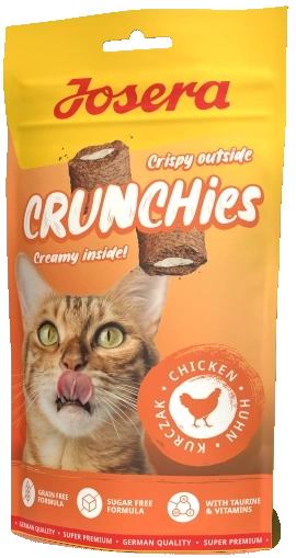- Josera Crunchies Przysmak dla Kota Kurczak 60g to delikatne i chrapiące poduszeczki ze smakowitym nadzieniem dla Twojego mruczka.