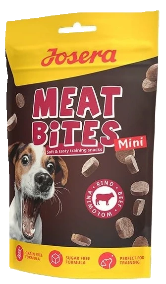 - Josera Meat Bites Mini Przysmak Dla Psa Wołowina 70g to smakowita przekąska dla Twojego czworonoga z delikatnym mięsem wołowym. Bez zbóż i cukru.
