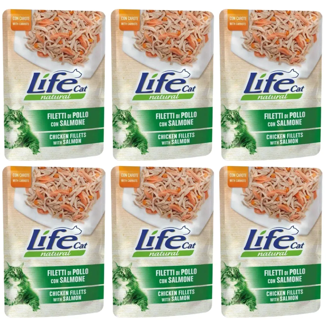- Life Cat Mokra Karma dla Kota Kurczak Łosoś 6x70g to zestaw 6 saszetek z kurczakiem, łososiem i marchewką