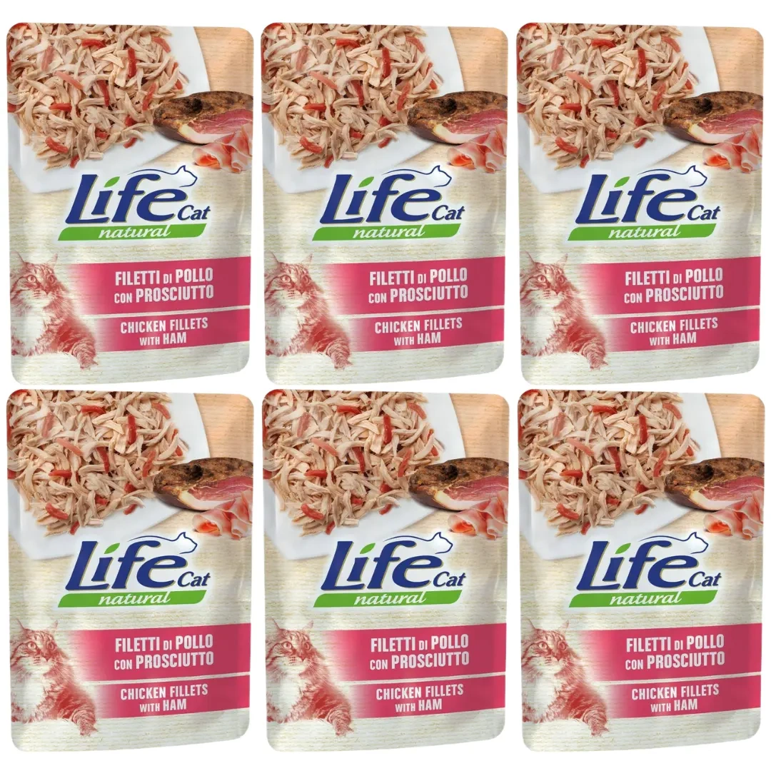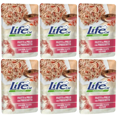 - Life Cat Mokra Karma dla Kota Kurczak Szynka 6x70g zestaw 6 saszet z szynką i kurczakiem.