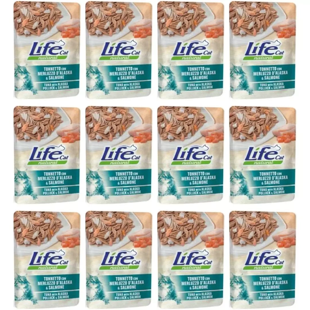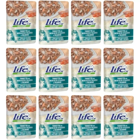 • Life Cat mokra karma dla kota z tuńczykiem, dorszem atlantyckim i łososiem to zestaw 12 saszetek po 70g smakowitej karmy dla kotów.