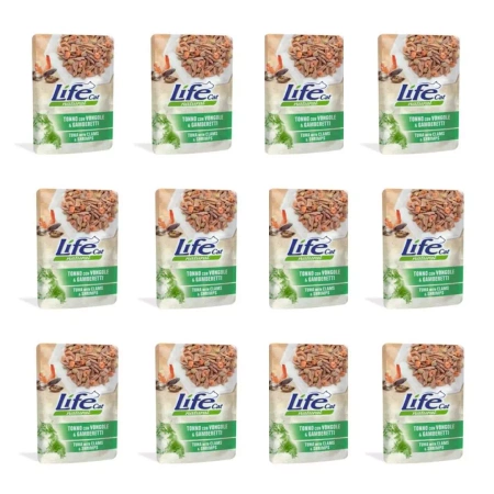 - Mokra karma dla kota w saszetkach od Life Cat z tuńczykiem, małżami i krewetkami to zestaw 12 saszetek po 70g.