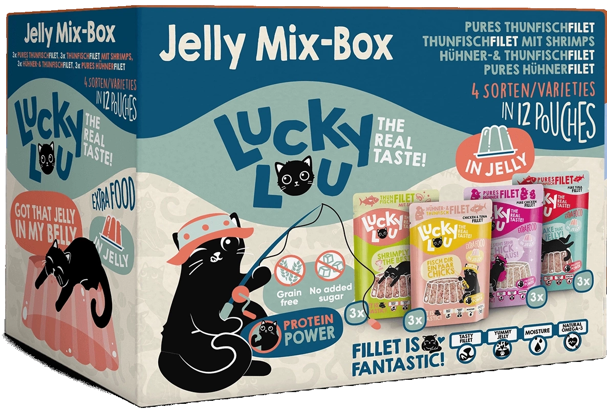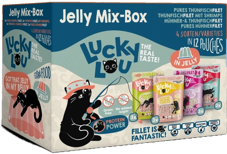 - Lucky Lou Karma Dla Kota Jelly-Mix-Box Saszetki 12x70g to zestaw mokrej karmy, której wyjątkowe smaki zachwycą nawet wybrednego mruczka. Bez cukru i zbóż.