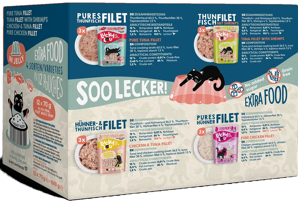 Mokra karma Lucky Lou Extrafood Broth-Mix-Box to smakowite dania mięsne w delikatnej galaretce, które pokocha Twój pupila.