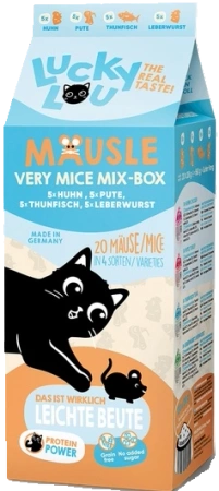 - Lucky Lou Karma Dla Kota Mausle MultiPack 20x28g 20ml to zestaw przysmaków dla Twojego mruczka, której wyjątkowe smaki zachwycą nawet wybrednego mruczka. Bez cukru i zbóż. Monoproteinowe.