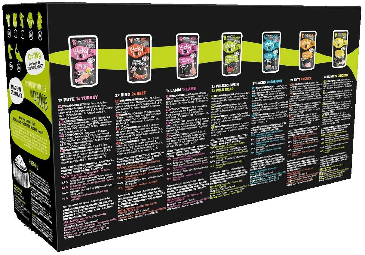- Lucky Lou SuperMono Karma Dla Kota Box Saszetki 12x125g to zestaw mokrej karmy, której wyjątkowe smaki zachwycą nawet wybrednego mruczka. Bez cukru i zbóż.