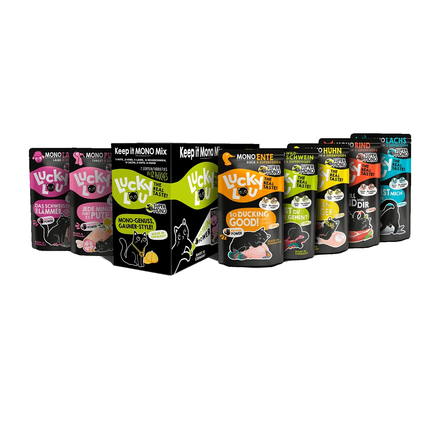 Mokra karma Lucky Lou SuperMono Keep it Mono Mix Multipack to smakowite dania monoproteinowe w delikatnej galaretce, które pokocha Twój pupila.