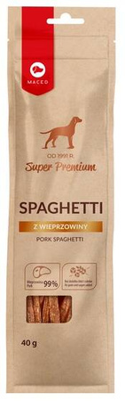 Jednym z naturalnych przysmaków od Maceda jest Spaghetti wieprzowe. Przekąska jest lekkostrawna, wzmacnia mięśnie żwaczowe psiaka oraz pielęgnuje jego jamę ustną. Dzięki niewybielaniu oraz niewędzeniu, a jedynie suszeniu, spaghetti nie zawiera popiołu i nie traci wartości odżywczych. Oprócz konserwantów nie zawiera również wzmacniaczy smaku, aromatu oraz wypełniaczy. Naturalna przekąska dla Twojego czworonożnego przyjaciela, która podczas gryzienia masuje dziąsła i wspomaga usuwanie kamienia nazębnego. Produkt przeznaczony dla psów w każdym wieku, nawet dla szczeniąt.