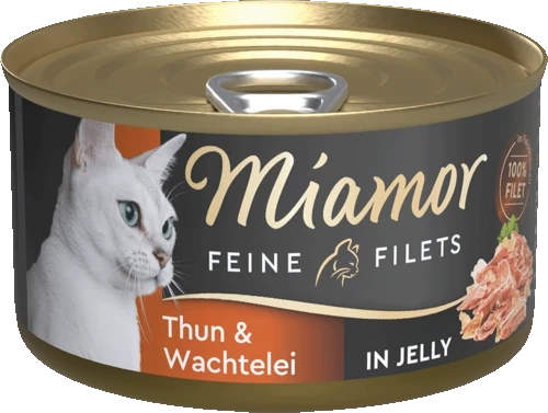 Mokra karma dla kota Miamor Feine Filets to bezzbożowy posiłek z mięsem tuńczyka i przepiórczymi jajkami w smakowitej galaretce.