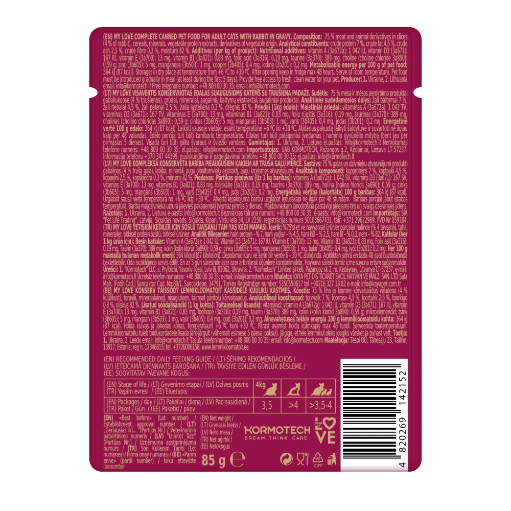 My Love Karma Mokra dla Kota Królik w Sosie 85g to kompletna karma dla kotów dorosłych.