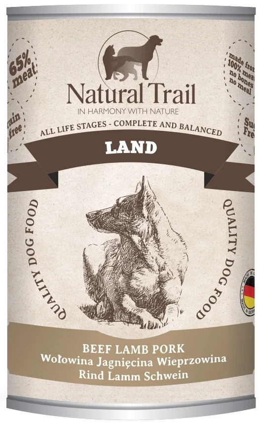 Karma mokra dla psów Natural Trail to pożywny posiłek z wysoką zawartością czystego mięsa. Z wołowiną, wieprzowiną oraz jagnięciną - to lekkostrawne rodzaje mięs, pełne witamin które wpierają odporność organizmu. Idealne dla wrażliwych żołądków.