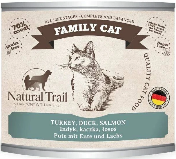 Mokra karma dla kota Natural Trail Family Cat to pożywny posiłek, biologicznie odpowiedni dla Twojego domowego drapieżnika zarówno dla kotów dorosłych, młodych oraz starszych.