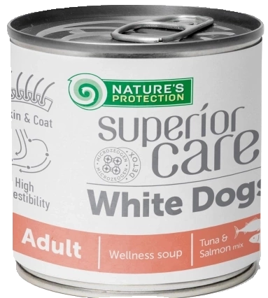 Mokra karma dla psa Nature's Protection Superior Care White Coat Grain Free with Tuna & Salmon for Adult All Breeds została stworzona dla psiaków o jasnej i białej sierści.