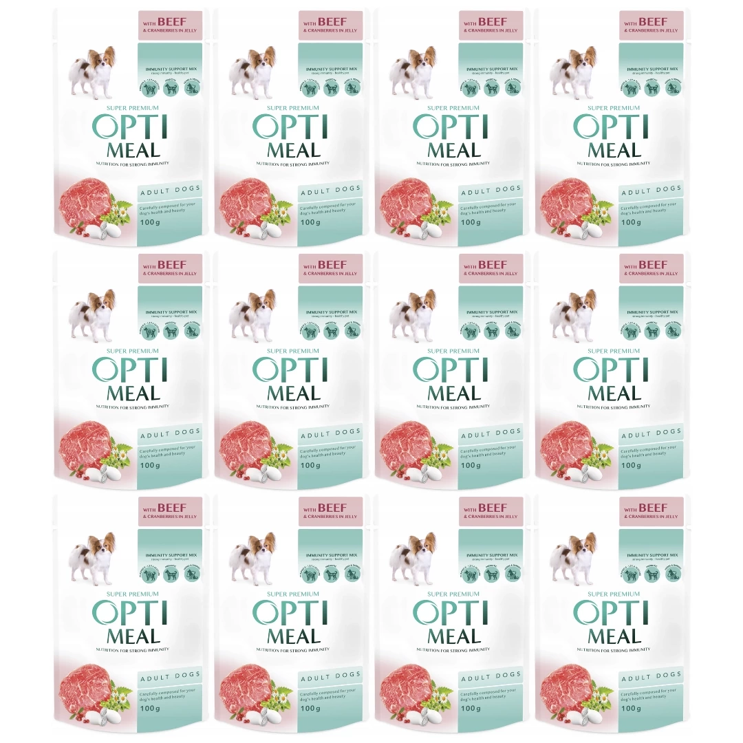 - Optimeal Karma Mokra dla Psa Wołowina Żurawina w Galaretce 100g pełnowartościowa mokra karma dla psów dorosłych. Karma wspierająca odporność. Zestaw 12 saszetek po 100 g każda.
