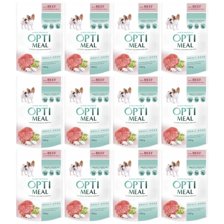 Optimeal Karma Mokra dla Psa Wołowina Żurawina 12x100g to zestaw 12 saszetek.