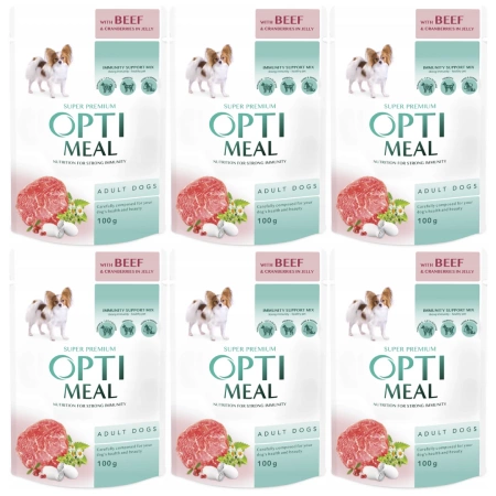 - Optimeal Karma Mokra dla Psa Wołowina Żurawina w Galaretce pełnowartościowa mokra karma dla psów dorosłych. Karma wspierająca odporność. Zestaw 6 saszetek po 100 g.