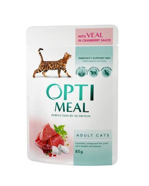 - Optimeal Kot Saszetka 85g Cielęcina Żurawina to pyszna karma dla kotów, rekomendowana przez lekarzy weterynarii.