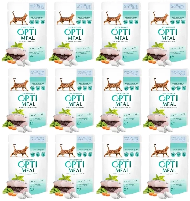 - Optimeal Mokra Karma dla Kota Dorsz Galaretka 12x85g to zestaw 12 saszetek pełnoporcjowej karmy mokrej dla kota o smaku dorsza z warzywami w galaretce.
