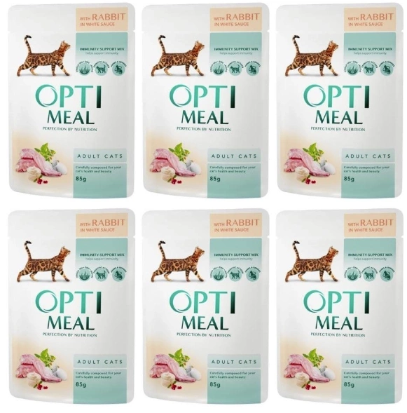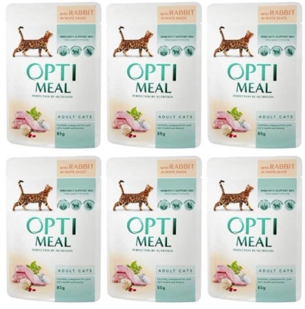 - Optimeal Mokra Karma dla Kota Królik w Sosie 6x85g to pyszna karma mokra dla Twojego pupila, z delikatnym mięsem królika. Zestaw 6 saszetek po 85g.