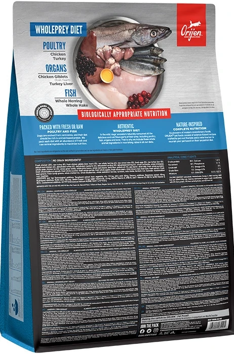 W naturze psy czerpią składniki odżywcze z różnorodnych mięs, której często brakuje w tradycyjnych karmach dla psów zawierających tylko jeden składnik zwierzęcy, jak wysoko przetworzony kurczak i jagnięcina. Dlatego nagradzane jedzenie ORIJEN Original charakteryzuje bogactwo różnorodnych mięs w Biologicznie Odpowiednich proporcjach WholePrey, które odżywia organizm psa w najlepszy sposób: