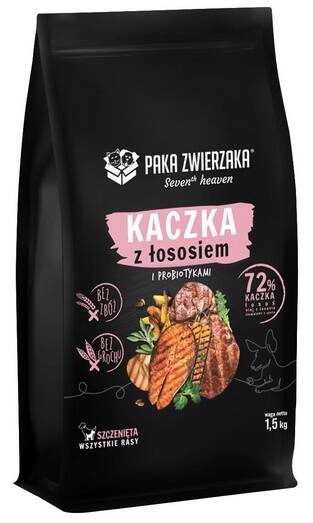 - Paka Zwierzaka Seventh Heaven Puppy Kaczka z łososiem to sucha karma dla szczeniąt z mięsem z kaczki bez dodatku zbóż.