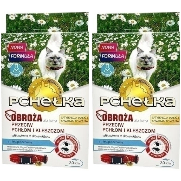 - Pchełka Obroża Dla Kota Na Pchły Kleszcze Dzwonek 30cm 2szt to zestaw zawierający 2 obroże dla kota. Z dimetikonem.