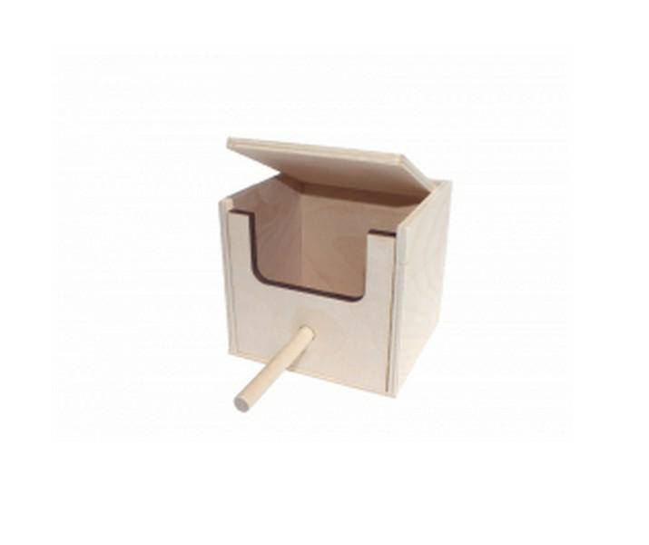Budka dla ptaków wykonana z drewna. Posiada otwieraną klapę oraz żerdź na której ptaki mogą przysiadać.