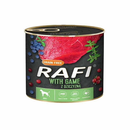 Mokra karma Rafi z dziczyzną charakteryzuje się wysoką zawartością pełnowartościowego białka oraz nienasyconych kwasów tłuszczowych, głównie n-3 odpowiedzialnych za wspieranie odporności. Mięso i surowce pochodzące z dziczyzny uzupełniają recepturę o aminokwasy - metioninę, izoleucynę i cystynę. Karma bezzbożowa zawiera selen i miedź w ilościach pokrywających zapotrzebowanie dorosłego psa. Dodatek owoców: borówki amerykańskiej i żurawiny, dzięki występującym w nich związkach biologicznie czynnych, głównie procyjanidyn i flawonoidów, wykazuje silne właściwości przeciwutleniające i przeciwzapalne. Z kolei tymianek sprawia, że karma jest bardziej smakowita.