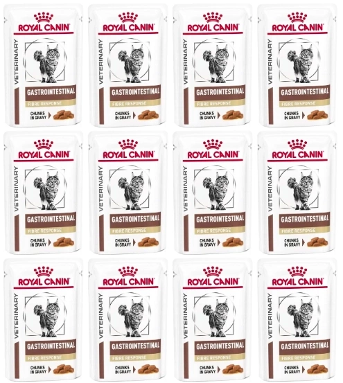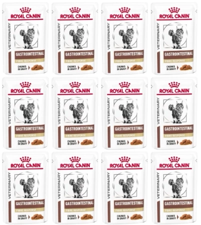 • Royal Canin Veterinary Diet Feline Gastrointestinal Fibre Response to karmy dla kotów, które mają tendencję do zaparć i zatwardzeń. Zestaw 12 saszetek.
