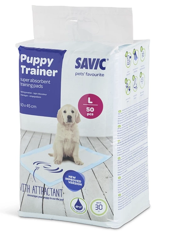 Higieniczne podkłady dla psa Savic Puppy Trainer L są specjalnie zaprojektowane dla średnich i dużych ras, zapewniając odpowiednią i wygodną przestrzeń dla szczeniaka, aby mógł się załatwić.