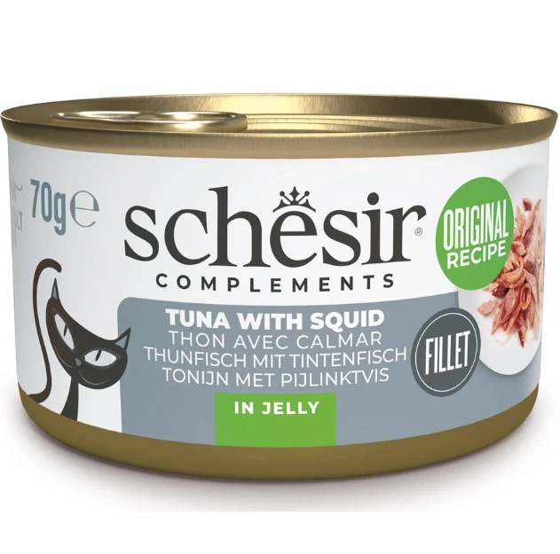 Mokra karma dla kota Schesir in Jelly to smakowity posiłek z tuńczykiem i kalmarami, które rozpieści podniebienie Twojego mruczka. Kawałeczki mięsa zanurzone w galaretce.