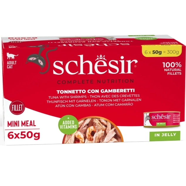 - Schesir in Jelly Karma Dla Kota Tuńczyk Krewetki Box 6x50g to zestaw smakowitej mokrej karmy gotowanej na parze, która uzupełni dietę Twojego mruczka. Bez zbędnych dodatków.