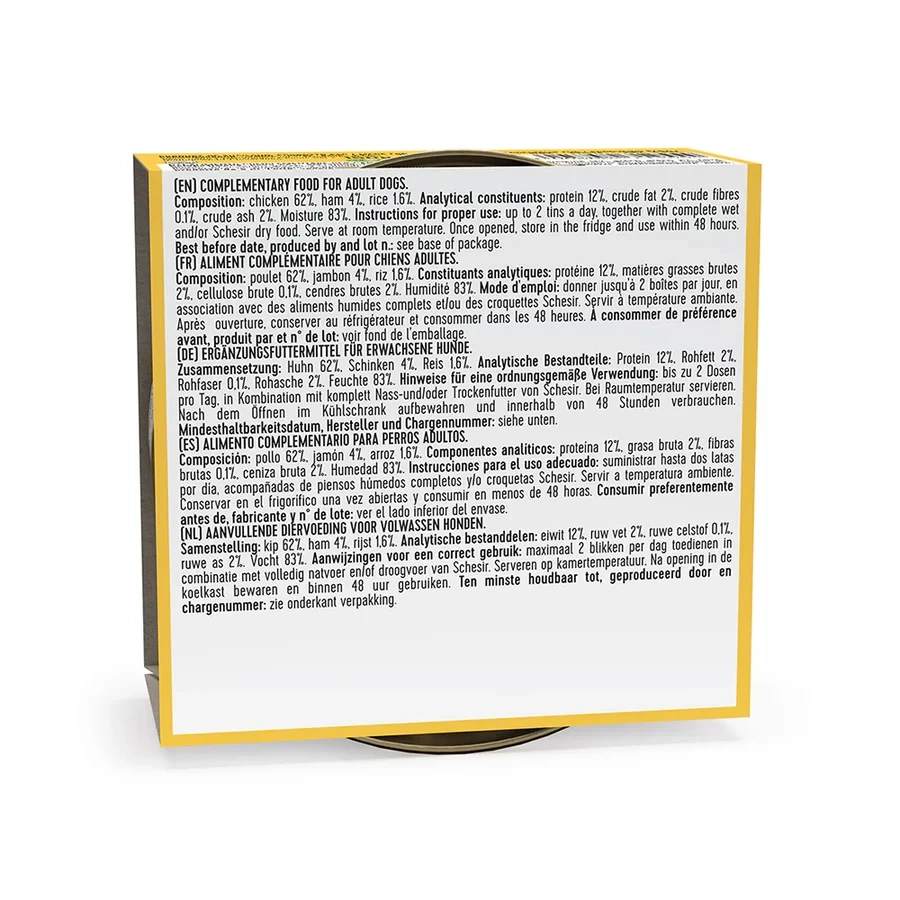 Mokra karma dla psa Schesir in Jelly to smakowity posiłek z kurczakiem i szynką, które rozpieści podniebienie Twojego czworonoga. Kawałeczki mięsa zanurzone w aromatycznej galaretce.