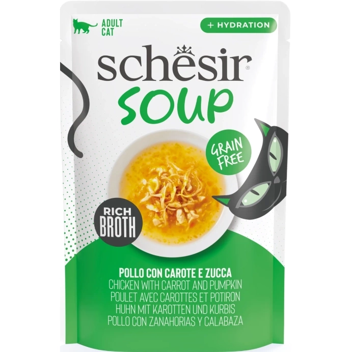 - Schesir Soup Karma dla Kota Zupa Kurczak Dynia 40g to bezzbożowe danie w postaci smakowitej zupy dla Twojego mruczka.