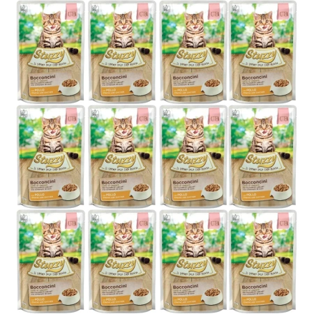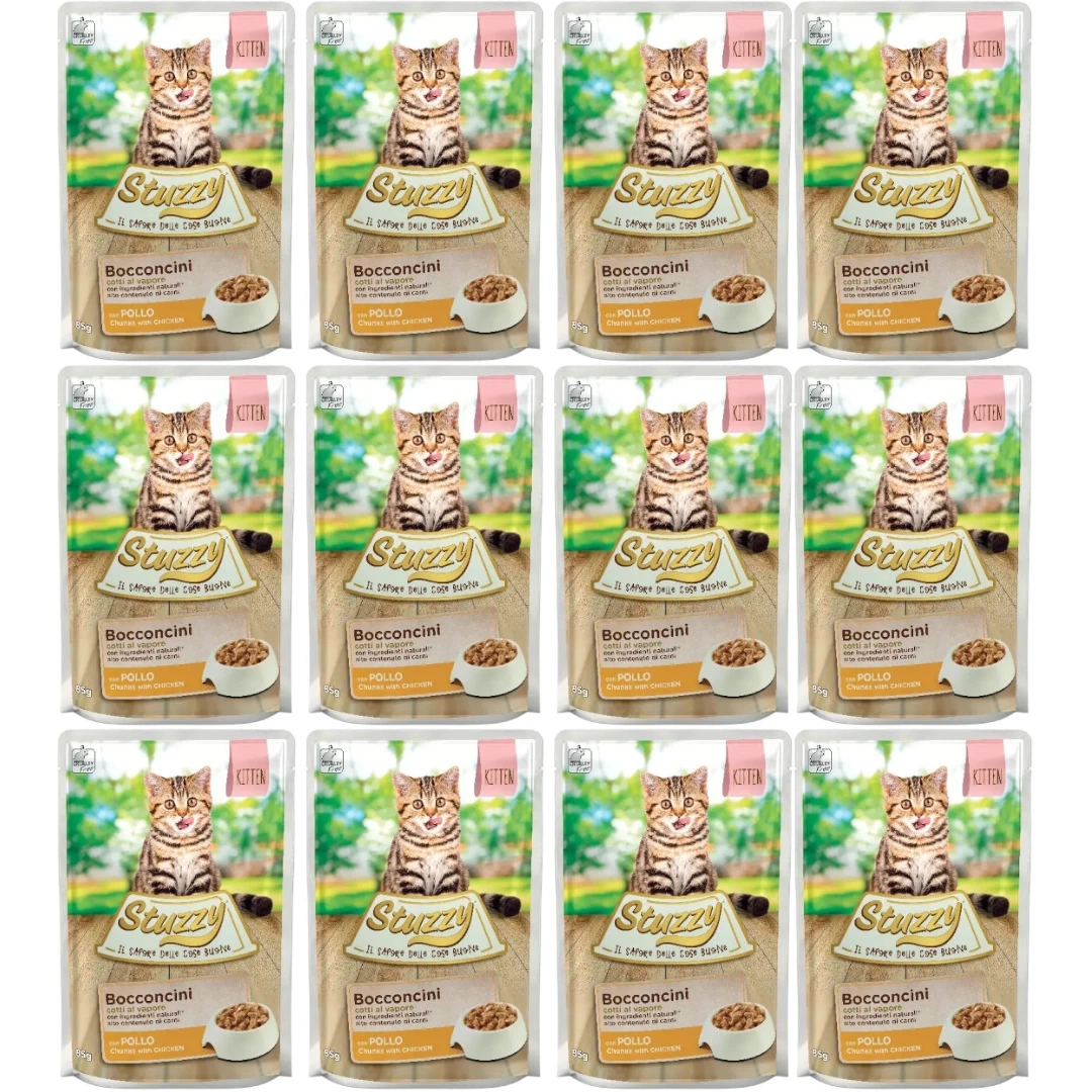 - Stuzzy Bocconcini Mokra Karma dla Kociąt Kurczak 12x85g jest to zestaw 12 saszetek kompletnej mokrej karmy dla kociąt.